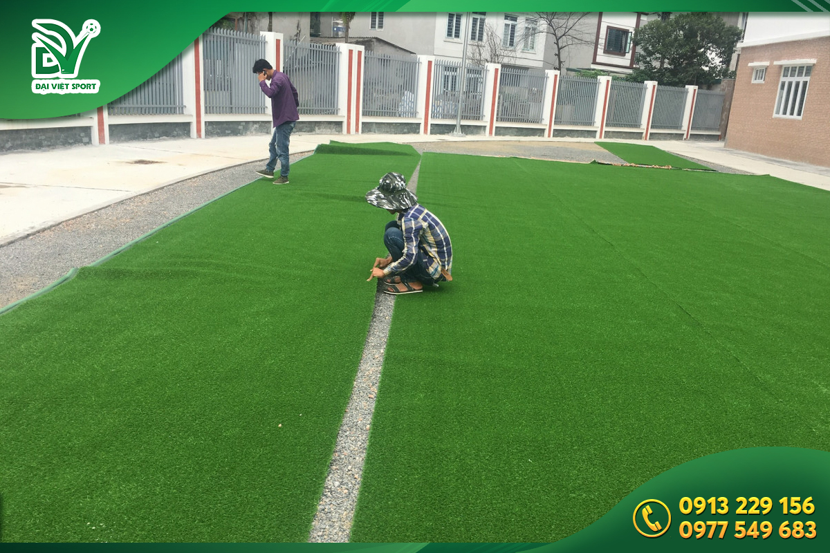 - Trải cỏ theo thiết kế, dán mối nối bằng keo chuyên dụng, ghim cố định.